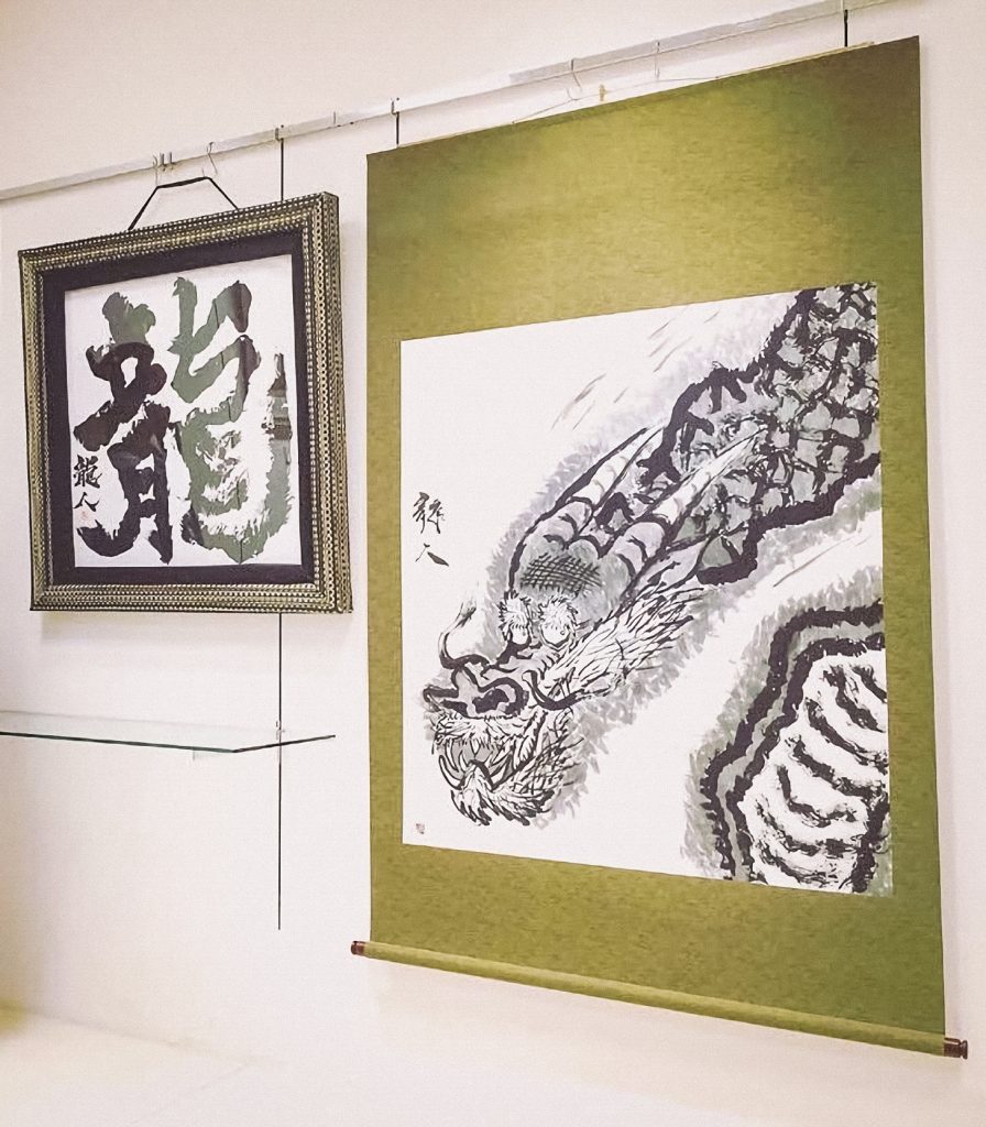 オーダーメイドした畳の額にしたためた龍の書と軸装した自身最大の龍画